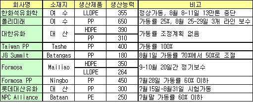 3개 라인 보수에 1개는 90% 가동 … 아시아 PP 가동감축 줄줄이 아시아 폴리머(Polymer) 시장은 8월말 들어 유가 하락세가 진정이 되고 있음에도 불구하고 위축된 모습을 보여 가격하락과 가동률 조정이 지속되고 있다.필리핀 NPC Alliance는 7월말부터 PE(Polyethylene) 25만톤 플랜트의 가동률을 60%로 낮추었고, Formosa는 Ningbo 소재 PP(Polypropylene) 45만톤 플랜트의 가동률을 7월28일 60% 이하로 조절했다. 8월 들어서는 JG Summit이 Batangas 소재 PP 18만톤 플랜트의 가동률을 70%에서 50%로 낮추었다.