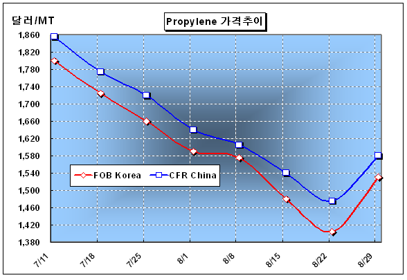 FOB Korea 1525-1535달러 형성 … 태광 정기보수 2009년으로 연기 프로필렌 가격은 8월 다섯째 주에 FOB Korea 톤당 1503달러로 125달러 폭등했다.아시아 프로필렌(Propylene) 가격은 중국의 석탄 공급부족에 따른 전력난 우려와 Spot 구매가 늘어난 영향으로 3주만에 다시 1530달러로 껑충 뛰어올랐다. 중국은 석탄을 원료로 전력을 생산하고 있는데 석탄 부족이 표면화되고 아크릴산(Acrylic Acid), PO(Propylene Oxide)를 비롯한 프로필렌 유도제품 플랜트가 베이징(Beijing) 올림픽 종료 후 단전될 것을 우려해 가동률을 최고 수준으로 끌어올리고 있기 때문이다. 이에 따라 최종수요처들은 9월19일에서 10월9일 거래 물량에 대해 FOB Korea 톤당 1510-1520달러를 제시했으나 유통기업들의 오퍼는 1550달러에 달한 것으로 알려졌다.