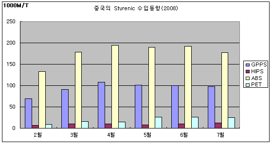 7월 HIPS 수입은 19.3% 증가 … ABS는 7.2% 줄어 18만톤 미달 2008년 6월 증가세로 전환된 중국의 Styrenics 수입이 7월 감소세로 전환됐다.GPPS(General-Purpose Polystyrene) 수입은 2008년 2월 6만9586톤에서 3월 9만1381톤으로 31.3% 증가세로 전환된 후 4월에도 10만8051톤으로 18.2% 증가했지만 5월 10만1654톤으로 5.9% 감소했으며 6월에도 1.4% 소폭 감소해 10만130톤에 그쳤고 7월 2.4% 감소하면서 9만7629톤이 수입된 것으로 집계됐다. ABS(Acrylonitrile Butadiene Styrene)도 2월 13만2563톤에서 3월 17만8196톤으로 34.4% 증가한 후 4월 들어서도 9.1% 증가하며 19만4471톤을 수입했으나 5월에는 2.7% 감소해 18만9185톤에 그쳤고 6월에는 1.2% 증가하면서 19만1620톤을 수입했다. 그러나 7월에는 7.2% 감소하면서 17만7749톤에 그쳤다. PET(Polyethylene Terephthalate)는 2월 9142톤에서 3월 1만5824톤으로 무려 73.0% 폭증한 후 4월 3.5% 감소하며 1만5265톤에 그치는 등 들쭉날쭉한 행보를 나타냈고 5월에는 다시 70.1%의 폭증해 2만5963톤이 수입됐고 6월에도 1.4% 증가해 2만6350톤에 달했으나 7월에는 2만5197톤에 그쳤다.