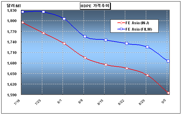 CFR FE Asia 1590-1600달러 … Fomosa HDPE 35만톤 정기보수 HDPE 가격은 8월 다섯째 주에 1595달러로 50달러 하락했다.아시아 HDPE(High-Density Polyethylene) 가격은 국제유가 하락과 중국의 재고과잉에 따른 수요 부진의 영향으로 8주 연속 하락해 1600달러 밑으로 추락했다. 멕시코만 유전이 허리케인 구스타프(Gustav)에 별다른 피해를 입지 않은 것으로 알려지면서 국제유가가 배럴당 105달러로 하락했기 때문이다. 여기에 중국 동부와 북부를 중심으로 보세창고(Bonded Warehouse)의 재고물량이 넘쳐나면서 구매 수요가 위축된 것도 HDPE 가격 하락의 요인으로 작용하고 있다. 중국의 HDPE 내수가격은 Film 그레이드 기준 Ex-works 톤당 1만3500-1만3800위안으로 하락했다.