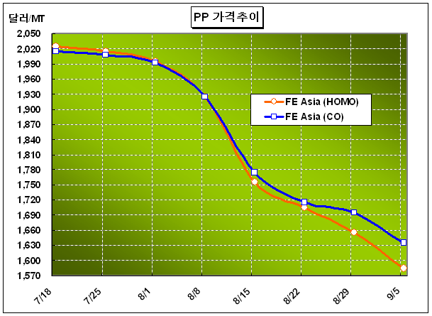 CFR FE Asia 1580-1590달러 … 10월 이후 수요 회복 가능성 PP 가격은 9월 첫째 주에 CFR FE Asia 톤당 1585달러로 70달러 폭락했다.아시아 PP(Polypropylene) 가격은 국제유가 및 나프타(Naphtha) 가격의 하락이 장기화되면서 6주 연속 하락해 1600달러 아래로 곤두박질 쳤다. 중국 베이징(Beijing)올림픽 폐막효과로 PP 수요가 회복될 것이라는 예상을 뒤엎고 수요가 위축되고 있는 가운데 나프타 가격이 1000달러 밑으로 추락함에 따라 추가하락에 대한 심리가 확산되면서 유통기업은 물론 최종수요처들이 구매를 보류하고 있기 때문이다. 이에 따라 아시아 PP 가격은 Raffia/Injection 그레이드가 1580-1590달러, IPP Film 및 BOPP 그레이드가 1610-1620달러, Block Copolymer 그레이드가 1630-1640달러로 급락했다.