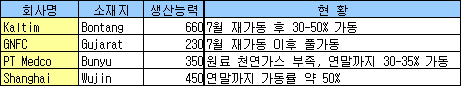 GNFC 외에는 가동률 바닥수준 … Spot 가격 9월부터 상승할 가능성 아시아 메탄올(Methanol) 시장이 공정 트러블로 인한 가동 불안과 가동률 조정 등으로 수급이 타이트가 심화되고 있다.Kaltim Methanol의 Bontang 소재 66만톤 플랜트는 파이프 누출사고로 7월 말 재가동에 들어갔으나 가동률은 30-50%에 그치는 것으로 알려졌다.