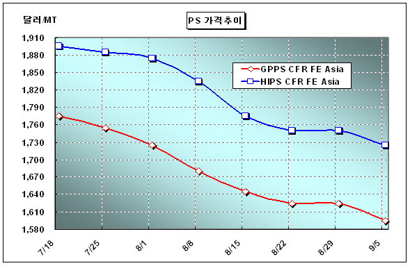 CFR FE Asia 1595달러 형성 … 중국 PS 수요 회복 가능성 주목 아시아 PS(Polystyrene) 가격이 30달러 하락해 1600달러 아래 수준을 형성했다.GPPS(General-Purpose PS) 가격은 9월3일 CFR China 톤당 1590-1600달러를 형성했고, HIPS(High-Impact PS) 가격은 CFR China 톤당 1720-1730달러를 나타냈다. 원료인 SM(Styrene Monomer)이 국제유가 및 나프타(Naphtha) 하락으로 26달러 하락함에 따라 PS 가격하락이 유도된 것으로 해석된다.
