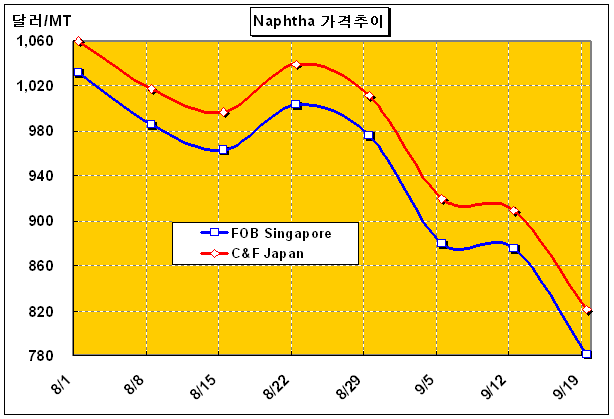 C&F Japan 821달러로 89달러 폭락 … 미국 금융위기 파급효과 막대 나프타 가격은 9월 셋째 주에 C&F Japan 톤당 821달러로 89달러 추락했다.아시아 나프타(Naphtha)가격은 국제유가 상승에도 불구하고 유럽 수출 수요가 위축된 영향으로 마침내 900달러가 무너져 4달만에 최저치를 갱신했다. 허리케인 아이크(Ike)가 멕시코 만 유전을 지나쳤으나 유전의 피해가 크지 않아 전략 비축유를 방출할 필요가 없고 휘발유 부족 상태도 일시적인 것으로 파악되면서 국제유가가 6달러 남짓 상승하는데 그쳤다. 여기에 9월16일 미국의 거대 투자은행인 리먼브라더스의 파산, 메릴린치(Merrill Lynch) 매각과 AIG 생명이 부도 사실이 보도되자 10월 유럽 인도분 휘발유 선물(RBOB) 가격이 톤당 799달러로 11달만에 최저치를 갱신하면서 유통기업들이 추가하락을 기대하고 구매 수요를 보류하고 있는 것도 나프타 가격 하락의 요인으로 작용했다.