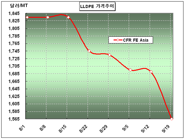 LLDPE 가격은 9월 셋째 주에 CFR FE Asia 톤당 1565달러로 125달러 폭락했다.