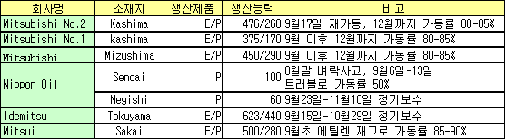 Mitsubishi 가동률 80-85%로 조정 … Nippon Oil도 벼락사고 후유증 Mitsubishi Chemical이 Kashima 소재 No.1 및 No.2 크래커와 Mizushima 크래커의 가동률을 모두 80-85%로 조정하는 등 정기보수에도 불구하고 일본의 에틸렌 크래커 가동률이 여전히 하향화되는 것으로 나타났다.
