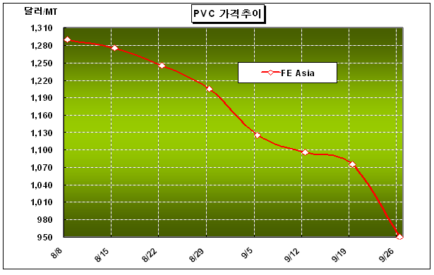 CFR FE Asia 945-955달러 … 카바이드 베이스는 3중고 진통 PVC 가격은 9월 넷째 주에 CFR FE Asia 톤당 950달러로 126달러 추락했다.아시아 PVC(Polyvinyl Chloride) 가격은 미국의 구제금융 부결과 중국의 재고과잉에 따른 수요 부진으로 1000달러가 무너지면서 16개월만에 최저치를 기록했다. 미국 재무부가 부실 금융기관에 공적자금을 투입하기로 했으나 국회의 반대에 부딪혀 부결된 영향으로 국제유가가 다시 하락하면서 에틸렌(Ethylene)은 물론 프로필렌(Propylene) 가격마저 하락했다. 더욱이 건축경기가 악화되고 있는 가운데 최종수요처들과 유통기업들이 중국 국경일(National Holiday)에 따른 가격 하락효과를 기대하고 구매를 보류하고 있는 것도 PVC 폭락에 영향을 미치고 있다. 일부 PVC 생산기업은 공급가격으로 CFR China 톤당 960-1000달러을 제시했으나 거래는 불발로 끝난 것으로 알려졌다.