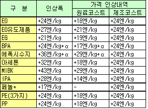 일본산 나프타 가격은 1-3월 6만6700엔을 기록했다. Mitsui Chemicals은 나프타 소비량이 600만kl에 달해 가격인상에 나서지 않으면 600억엔의 손실이 발생할 것으로 예상되자 7-9월 나프타 가격을 7만7000엔으로 상정하고 EO(Ethylene Oxide)와 폴리올레핀(Polyolefin) 등 기초화학제품과 기능성수지 가격을 7월1일부터 인상했다. 4-6월에도 나프타 가격이 6만9000-7만엔으로 상승했으나 Mitsui Chemicals이 자체적으로 흡수했다. 다만, 나프타 상승분과는 별도로 연료ㆍ용역비용 상승분도 가격인상에 반영시킬 것을 요구해 수요처들의 반발이 상당했던 것으로 알려졌다. 2004년 이후 10번 이상 가격인상을 단행했지만 원료코스트 상승분만 반영하고 연료코스트 상승분은 전가하지 않았기 때문이다. 표, 그래프: | Mitsui Chemicals의 가격인상 방안 | <화학저널 2008/10/2> |