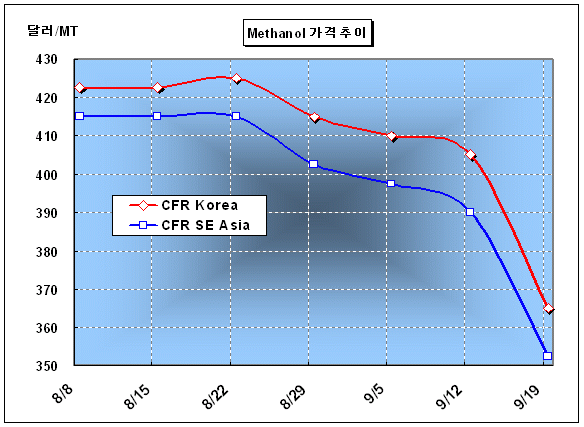 아시아 가동률 바닥에도 하락세 … 계약가격은 460달러 수준 메탄올(Methanol) Spot 가격이 9월 400달러 선을 지켜내지 못하면서 300달러까지 붕괴되는 것이 아닌지 우려되고 있다.아시아 메탄올 가격은 9월26일 기준으로 CFR Korea 톤당 360-370달러로 하락했다. 아시아 시장이 전반적으로 높은 재고를 나타내고 있기 때문으로 중국도 공장도가격이 톤당 125위안 떨어져 3050위안을 나타냈다.