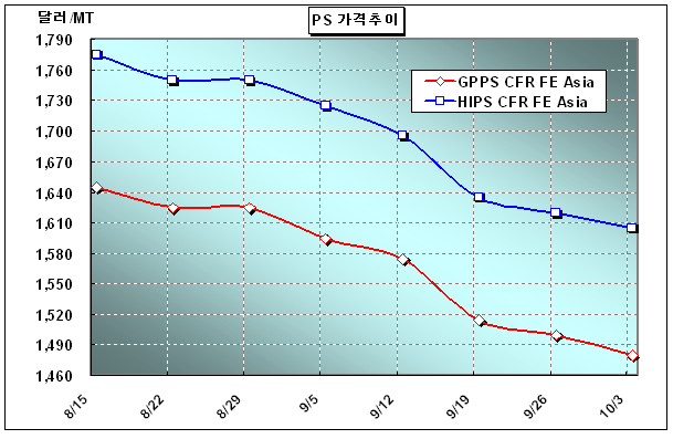 CFR FE Asia 1600-1610달러 … LG 재가동ㆍIdemitsu 가동중단 HIPS 가격은 10월 둘째 주에 CFR FE Asia 톤당 1605달러로 15달러 하락했다.아시아 HIPS(High Impact Polystyrene) 가격은 국제유가와 업스트림 SM(Styrene Monomer) 가격하락의 영향으로 1600달러도 위태롭게 됐다. 국제유가는 미국 구제금융법안의 통과에도 불구하고 경기침체가 고착화될 것이라는 불안심리가 작용해 89.4달러로, SM(Styrene Monomer) 가격도 FOB Korea 톤당 1270달러로 하락했다. 여기에 중국이 9월29일부터 10월5일까지 국경일(National Day) 연휴 동안 가동을 중단하면서 구매 수요가 실종된 것도 HIPS 가격 하락의 요인으로 작용했다.