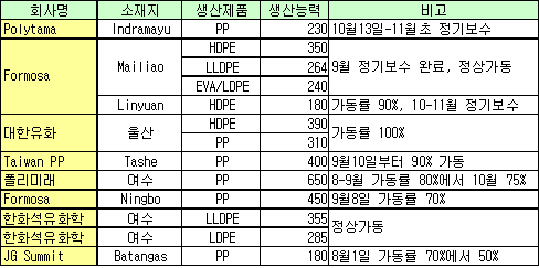 Formosa, PE 플랜트 정기보수 완료 … PP는 가동률 하향조정 지속 Formosa의 Mailiao 소재 PE(Polyethylene) 플랜트가 한달 간의 정기보수를 마치고 9월말부터 정상 가동에 들어간 것으로 알려졌다.Formosa의 Mailiao PE 플랜트는 HDPE(High-Density PE) 35만톤, LLDPE(Linear Low-Density PE) 26만4000톤, EVA(Ethylene Vinyl Acetate)/LDPE 24만톤의 생산능력을 갖추고 있다. Pollytama의 Indramayu 소재 PP(Polypropylene) 플랜트는 10월13일부터 11월 초까지 정기보수에 들어갈 예정이다. JG Summit의 Batangas PP 18만톤 플랜트가 8월1일부터 가동률을 70%에서 50%로 끌어내렸으며 Formosa의 Ningbo 45만톤 플랜트도 9월8일 가동률이 70%인 것으로 확인됐다.