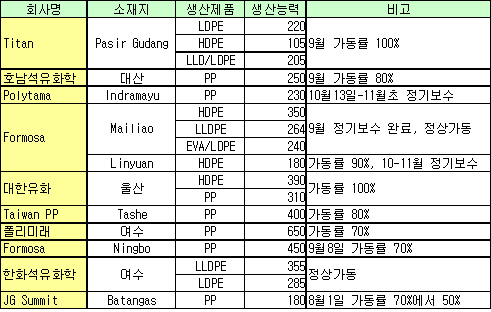 호남석유화학도 PP 80% 가동 … Formosa는 정기보수 후 정상가동 호남석유화학이 여수 소재 PP(Polypropylene) 25만톤 플랜트의 가동률을 9월부터 80% 수준으로 낮추기 시작했다.이어 10월에도 Taiwan PP가 가동률을 80%로 5% 낮추고 폴리미래도 계획했던 것보다 낮은 70%의 가동률을 보이는 등 아시아 PP 가동률이 여전히 바닥을 치고 있다.