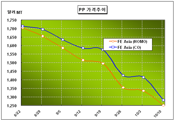 CFR FE Asia 1250달러로 85달러 폭락 … 중동 공급물량 경계 주의보 아시아 PP 가격이 CFR China 톤당 1335달러에서 1250달러로 10월 둘째 주(수요일 기준) 들어 평균 85달러 폭락했다.PP(Polypropylene) 가격은 Raffia/Injection 그레이드가 CFR FE Asia 1245-1255달러, IPP Film은 1295-1305달러, BOPP는 FE Asia 1275-1285달러, Block Copolymer는 FE Asia 1275-1285달러를 형성했다.