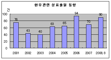 또 2008년 8월 말 90건이 출원돼 2007년 전체 출원 건수 70건을 이미 넘어섰고, 2008년 말까지는 120건 이상 출원돼 전년대비 80%이상 증가할 것으로 예상되고 있다. 한우관련 대표적인 상표출원으로 강원도 <횡성한우>, <대관령한우>, <홍천한우 늘푸름>, 경기도 <안성마춤한우>, <물맑은 양평개군한우>, 충청북도 <속리산 황토조랑우랑>, <청풍명월한우>, 충청남도 <토바우>, <하눌소>, 전라북도 <장수한우>, <복분자한우>, 전라남도 <지리산 순한 한우>, <함평 천지한우>, 경상북도 <영주한우>, <상주 감먹는 한우>, 경상남도 <합천 황토한우>, <남해 화전한우>, 제주도 <보들결> 등이 출원 또는 등록됐다. 특허청 관계자는 “한우를 우수 브랜드로 육성하기 위해서는 위생, 안전성 및 품질을 지속적으로 높이는 노력과 함께 개발된 브랜드를 상표로 등록해 지속적으로 홍보함으로써 독자적인 인지도를 높여나가는 것이 중요하다”고 지적했다. 특히, “한우와 관련된 브랜드를 상표로 등록하지 않고 사용하면 타인이 브랜드를 자기의 상표로 사용하더라도 적극적인 대응이 어려워져 애써 쌓아올린 명성에 흠이 갈수 있으며, 특허청에 등록된 상표를 사용해도 등록된 상표와 동일하게 사용해야 상표등록이 취소되지 않는다는 점에 특별히 주의해야 한다”고 강조했다. 한편, 일본은 토종 와규(和牛)를 한우의 5배, 미국산의 10배 이상 비싼 가격에도 널리 팔리는 우수한 브랜드로 육성한 것으로 알려져 있다. 표, 그래프: | 한우관련 상표출원 동향 | <화학저널 2008/10/16> |