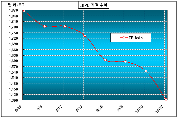 CFR FE Asia 1390-1400달러 … Formosa Plastics LDPE 수율 높여 LDPE 가격은 10월 셋째 주에 CFR FE Asia 톤당 1395달러로 150달러 폭락했다.아시아 LDPE(Low-Density Polyethylene) 가격은 에틸렌 유도제품 수요 감소로 다시 한번 2008년 최저치를 갈아치우면서 1400달러가 붕괴됐다. 세계경제 침체의 영향으로 PE 수요가 감소할 것이라는 우려가 일파만파로 확산되면서 최종수요처 및 유통기업들이 구매결정을 보류하고 있기 때문이다. 이에 따라 일부 LDPE 생산기업은 11월 인도물량에 대해 CFR China 톤당 1400달러를 오퍼했으나 유통기업들은 1200달러 선에서 구매의사를 나타내 무산된 것으로 알려졌다.