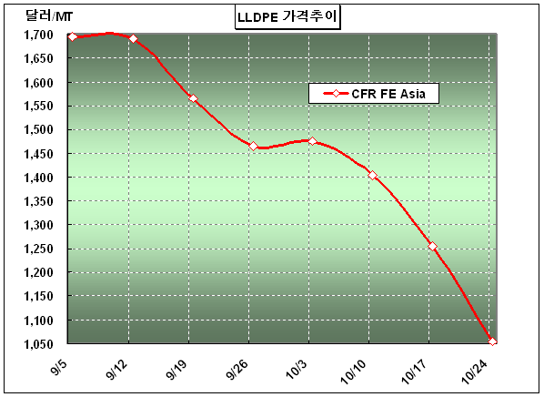 CFR FE Asia 1050-1060달러 … Formosa 감산ㆍ가격인하 효과 없어 LLDPE 가격은 10월 넷째 주에 CFR FE Asia 톤당 1055달러로 200달러 폭락했다.아시아 LLDPE(Linear Low-Density Polyethylene) 가격은 중국의 수요 감소와 재고과잉의 영향으로 1200달러가 붕괴되며 2008년 최저치를 다시 한번 갈아치웠다. 중국의 최종수요처 및 유통기업들은 경기악화로 금융기관으로부터 신용장(Letters of Credit)을 발급받지 못해 Spot 시장에서 일시적으로 자취를 감추면서 재고가 폭주했기 때문이다. 여기에 업스트림 에틸렌이 국제유가 하락의 영향으로 505달러로 곤두박질친 것도 LLDPE 가격 하락의 요인으로 작용하고 있다.