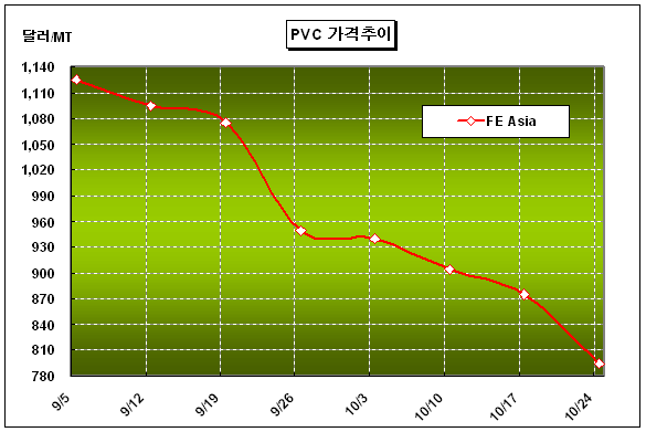 CFR China 790-800달러 형성 … 한화석유화학은 가동률 조정 시작 아시아 PVC(Polyvinyl Chloride) 가격은 10월 넷째 주 들어 톤당 80달러 하락하며 CFR China 톤당 790-800달러로 2006년 12월 중순 이후 처음으로 800달러 이하를 나타냈다.국제경기 악화에 따른 우려로 인한 플래스틱 수요위축이 중국을 중심으로 확산되면서 11월 판매까지 예측불허 상황으로 내몰리고 있기 때문이다. 일부 PVC 생산기업들은 10월 초 거래를 마쳐 CFR China 톤당 880달러에 계약했고 11월에도 톤당 800달러 이상을 유지하겠다고 밝히고 있지만 현실적인 어려움이 예상된다.