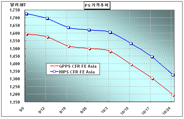 CFR FE Asia 1320-1330달러 … 중국 일부 품목 증치세 환급률 인상 GPPS 가격은 10월 넷째 주에 CFR FE Asia 톤당 1325달러로 120달러 폭락했다.아시아 GPPS(General Purpose Polystyrene) 가격은 국제유가와 업스트림 SM(Styrene Monomer) 가격 하락의 영향으로 1300달러 마저 위태롭게 됐다. OPEC의 감산 소식에도 불구하고 국제유가가 배럴당 64달러로 하락하자 최종수요처들이 추가 하락을 기대하고 구매를 보류함으로써 SM 가격이 8개월 만에 최저치를 기록하며 추락했기 때문이다. 이에 따라 SM과의 스프레드는 100-120달러 확대됐다. HIPS(High Impact Polystyrene) 가격도 1325달러로 120달러 폭락했으나 GPPS와의 스프레드는 130달러를 유지하고 있다. 다만, 세계 자동차 시장의 불황으로 부타디엔(Butadiene) 고무 수요가 감소하고 있어 GPPS와의 스프레드가 좁혀질 것이 확실시되고 있다.