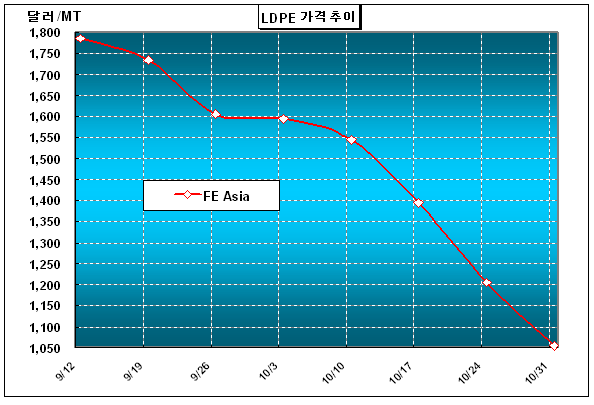 CFR FE Asia 1050-1060달러 … 중국 수출증치세 인상효과 없어 LDPE 가격은 10월 다섯째 주에 CFR FE Asia 톤당 1055달러로 150달러 폭락했다.아시아 LDPE(Low-Density Polyethylene) 가격은 업스트림 에틸렌 가격이 하락하고 중국의 수요가 감소한 영향으로 2005년 12월 이후 처음으로 최저치를 기록했다. 미국의 증시호조 소식에 국제유가가 배럴당 67.8달러로 상승했지만 에틸렌 가격이 355달러로 무려 150달러 폭락하고 경제침체에 따른 소비심리 위축으로 중국의 최종수요처들이 구매를 기피하고 있기 때문이다. 여기에 EVA(Ethylene Vynil Acetate) 가격이 CFR China 톤당 1650-1700달러로 폭락세를 이어가고 있는 것도 LDPE 가격 하락에 영향을 미치고 있다.