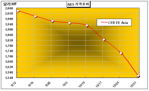 ABS 가격은 10월 다섯째 주에 CFR FE Asia 톤당 1725달러로 100달러 폭락했다.