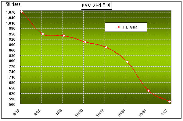 CFR FE Asia 570-580달러 … 대선 특수 무효과에 수출 수요 감소 PVC 가격은 11월 첫째 주에 CFR FE Asia 톤당 575달러로 60달러 추락했다.아시아 PVC(Polyvinyl Chloride) 가격은 세계경제 침체와 수요 감소로 2002년 3월 이후 처음으로 최저치를 기록했다. 미국 대선에 따른 경기회복 특수가 단발성으로 드러나면서 업스트림 에틸렌(Ethylene) 가격이 하락하자 최종수요처들이 추가 하락을 기대하고 구매를 보류하고 있기 때문이다. 여기에 일부 중국의 다운스트림 생산기업들이 미국과 유럽의 수출 수요 감소로 가동률을 감축하고 있는 것도 PVC 가격 하락에 영향을 미치고 있다.