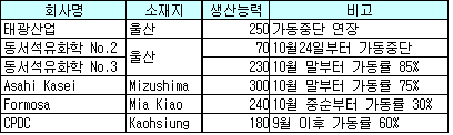 암모니아ㆍ프로필렌 가격하락 영향 … 동서석유화학은 감산 본격화 아시아 AN(Acrylonitrile) 가동률이 최저점을 향해 질주하고 있다.업스트림 암모니아(Ammonia) 가격이 하락하고 프로필렌(Propylene) 가격도 300달러 밑으로 곤두박질치면서 최종수요처들이 구매를 보류함으로써 재고가 폭주하고 있기 때문이다. 태광산업은 마진 악화를 이유로 가동률을 5-10% 감축한 이후 가동을 중단했으며 재가동 시기는 불투명한 상태이다.