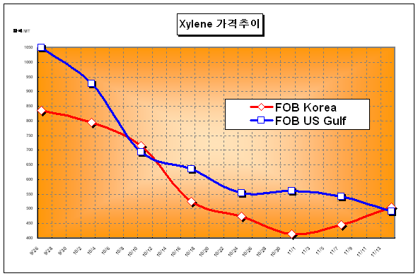 중국 내수가격도 급등해 ex-tank 톤당 6700-6800위안으로 수입가격 기준 톤당 810-822달러와 맞먹는 수준을 형성했다. 하지만, 중국 내수가격 변동이 심해 11월14일에는 CFR China 톤당 500달러 이하에 고시된 것으로 알려지고 있다. <이선애 기자> 표, 그래프: | Xylene가격추이 | <화학저널 2008/11/20> |