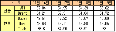 11월19일 0.78달러 내려 45.89달러 형성 … WTIㆍBrent도 약세 11월19일 두바이유 현물가격은 45달러 후반으로 하락했다.두바이유를 제외한 국제유가도 미국 원유 재고 증가 및 세계 경기침체 지속에 대한 우려로 하락했다. 한국석유공사에 따르면, 뉴욕상업거래소(NYMEX)에서 거래된 WTI(서부텍사스 경질유) 선물유가는 전일대비 0.77달러 하락한 53.62달러에, Brent 선물유가는 0.12달러 하락한 51.72달러에 거래를 마감했다. 두바이유 현물가격은 0.78달러 하락해 45.89달러를 형성했다.