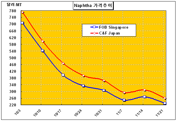 나프타 가격은 11월 셋째 주에 C&F Japan 톤당 262달러로 48달러 하락했다.