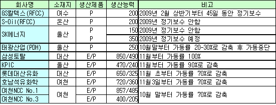 공급과잉 지속으로 가격정체 … 삼성토탈은 11월부터 100% 가동 미국 증시 호조에 따른 국제유가 상승과 아시아 크래커 가동률 감축의 영향으로 에틸렌(Ethylene) 가격이 보합세를 형성하고, 프로필렌(Propylene) 가격이 430달러로 155달러 폭등하고 있으나 국내 크래커는 당분간 가동률을 감축한 채 가동할 것으로 예상된다.GS칼텍스는 프로필렌 생산능력이 20만톤에 달하는 RFCC를 2009년 상반기부터 45일동안 정기보수할 예정이나, S-Oil은 2009년 온산 소재 프로필렌 생산능력이 20만톤인 RFCC를 정기보수 없이 가동할 계획이다. SK에너지는 2009년에 울산 소재 프로필렌 15만톤 크래커를 정기보수하지 않고 가동하는 한편, 35만톤 크래커는 정기보수할 예정이다.