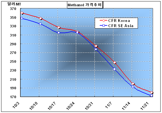CFR Korea 175-185달러로 20달러 하락 … 다운스트림 저가동 영향 메탄올 가격은 11월 첫째 주에 CFR Korea 톤당 180달러로 20달러 하락했다.아시아 메탄올(Methanol) 가격은 세계경제 침체 장기화에 대한 우려로 수요가 실종된 영향으로 8주만에 반도막이 났다. 미국 증시가 반짝 상승했으나 경제전문가들이 세계경제 침체가 2009년까지 이어질 것이라는 부정적인 전망을 내놓으면서 최종수요처들이 가격이 추가 하락할 것으로 기대하고 구매를 보류하고 있기 때문이다. 중국에서는 석탄 베이스 메탄올 생산기업들이 수익성 악화를 이유로 가동률을 감축함으로써 메탄올 공급부족이 심화되고 있는 가운데 정부가 4조위안에 달하는 경기부양책을 발표함에 따라 구매수요가 늘어나고 있다.
