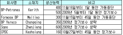 BP 가동중단ㆍ정기보수 … SopoㆍBP Yaraco 2009년 정기보수 생략 아시아 초산(Acetic Acid) 플랜트들이 줄줄이 가동률을 감축하고 있다.세계경제 침체 장기화에 대한 우려로 업스트림 메탄올(Methanol) 가격이 180달러로 곤두박질치고, 초산 다운스트림 수요 부진이 심화되면서 초산 가격이 추락했기 때문이다. BP-Petronas는 10월 말부터 Kerth 소재 초산 48만톤 플랜트의 가동률을 85%로 감축한 후 10월 하반기부터 20일 동안 일시적으로 가동을 중단한데 이어 11월16일부터 1달 동안 가동을 중단키로 결정했으며, 초산 50만톤 플랜트는 정상가동한 후 2009년 5월부터 1달 동안 정기보수에 들어갈 계획이다. Formosa BP는 10월30일부터 초산 30만톤 플랜트를 정상가동했으나 이후 11월15일부터 45일동안 가동을 중단한 후 2009년 재가동해 6월부터 1달간 정기보수할 예정이다.