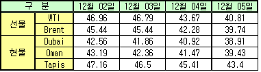 12월5일 2.01달러 내려 38.91달러 형성 … WTIㆍBrent도 하락 12월5일 두바이유 현물가격은 40달러가 붕괴되며 크게 하락했다.두바이유를 제외한 국제유가도 미국 고용지표 악화 등 경기침체가 심화되고 있음을 나타내는 소식이 연이어 전해지면서 하락했다. 한국석유공사에 따르면, 뉴욕상업거래소(NYMEX)에서 거래된 WTI(서부텍사스 경질유) 선물유가는 전일대비 2.86달러 하락한 40.81달러에, Brent 선물유가는 2.54달러 하락한 39.74달러에 거래를 마감했다. 두바이유 현물가격은 2.01달러 하락해 38.91달러를 형성했다.