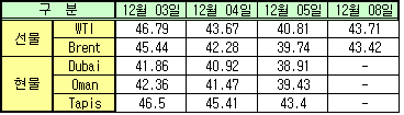 12월8일 WTIㆍBrent 3달러 안팎 올라 … 두바이유는 휴일로 폐장 12월8일 국제유가는 미국의 강력한 경기부양책 발표와 석유수출국기구(OPEC)의 감산 기대감으로 상승했다.한국석유공사에 따르면, 뉴욕상업거래소(NYMEX)에서 거래된 WTI(서부텍사스 경질유) 선물유가는 전일대비 2.90달러 상승한 43.71달러에, Brent 선물유가는 3.68달러 상승한 43.42달러에 거래를 마감했다. 두바이유 현물가격은 싱가폴 이슬람 축제(Hari Raya Haji) 휴일로 형성되지 않았다.
