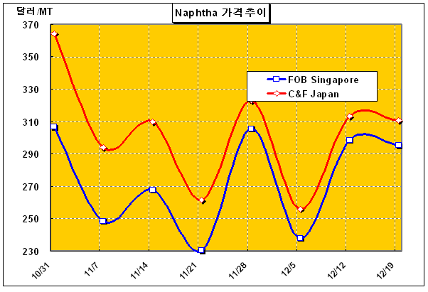 C&F Japan 309-311달러 … OPEC 감산에 미국 구제자금 별무 나프타 가격은 12월 셋째 주에 C&F Japan 톤당 311달러로 3달러 하락했다.아시아 나프타(Naphtha) 가격은 국제유가가 하락과 중국 춘절을 앞두고 수요가 감소한 영향으로 310달러에 안착했다. 국제유가는 OPEC(Organization of Petroleum Exporting Countries)이 12월17일 일산 220만배럴을 감산하고, 미국 정부가 빅3에 대해 174억달러의 단기 구제자금을 지급키로 결정했음에도 불구하고 달러화 강세, 경제침체에 따른 수요감소 우려, 미국의 재고 증가의 영향으로 배럴당 33.9달러로 2.4달러 하락했기 때문이다. 여기에 중국 춘절을 앞두고 구매수요가 소폭 줄어든 것도 나프타 가격 하락의 요인으로 작용했다.