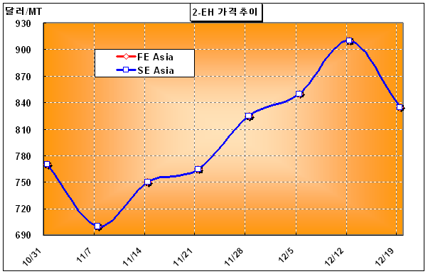 CFR China 830-840달러 형성 … Kyowa Hakko 3월 정기보수 예정 2-EH 가격은 12월 셋째 주에 CFR China 톤당 835달러로 75달러 폭락했다.아시아 2-EH(Ethylhexanol) 가격은 가소제 수요 감소에 따른 DOP(Dioctyl Phthalate) 수요 부진으로 마침내 900달러가 무너졌다. DOP 가격 하락에 따라 일부 유통기업들이 공급가격을 890달러에서 840달러로 인하했으나 최종수요처들이 추가 하락을 기대하고 구매를 보류하고 있기 때문이다. 중국의 2-EH 내수가격은 DOP 가격하락을 반영해 톤당 7300-7700위안으로 무려 500위안 이상 폭락한 것으로 알려지고 있다.