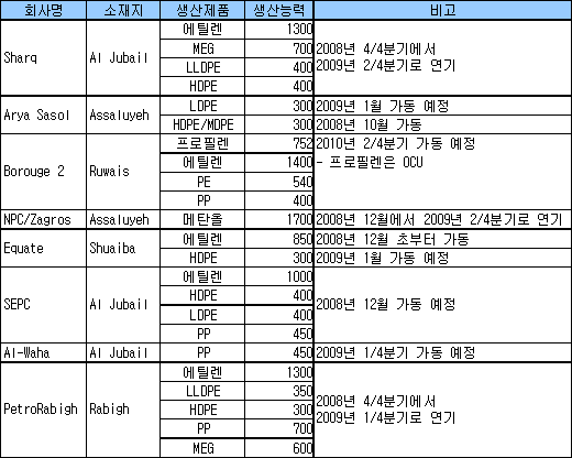 SharqㆍPetroRabigh 크래커 가동 연기 … 2009-10년 프로젝트 차질 중동의 신증설 프로젝트가 상당수 연기되고 있다.국제유가가 곤두박질치면서 수익성이 하락하고 프로젝트 코스트가 예상치를 훨씬 상회하고 있기 때문이다. Sharq는 Al Jubail에서 에틸렌 130만톤 크래커를 비롯해 MEG(Monoethylene Glycol) 70만톤, LLDPE(Linear Low-Density Polyethylene) 40만톤, HDPE(High-Density PE) 40만톤 플랜트의 가동을 2008년 4/4분기에서 2009년 4/4분기로 연기했다. Borouge2는 Ruwais에서 프로필렌 생산능력 75만2000톤의 OCU(Olefin Conversion Unit), 에틸렌 140만톤 크래커, PE 54만톤, PP 40만톤 플랜트를 건설하고 있으며 2010년 2/4분기 가동할 예정이다. NPC는 Zagros와 Assaluyeh에 메탄올(Methanol) 170만톤 플랜트를 합작 건설하고 2008년 12월 가동할 계획이었으나 2009년 2/4분기로 연기했다.