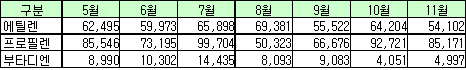 11월 에틸렌 15.7%에 프로필렌 6.1% 감소 … 부타디엔은 23.4% 증가 중국은 10월 올레핀 수입량이 부타디엔(Butadiene)을 제외하고는 모두 감소했다.에틸렌(Ethylene)은 2008년 5월 6만1495톤으로 1.7%, 6월 5만9973 2.5% 감소했으나 7월 6만5898톤으로 9.9% 증가했으나 9월에는 5만5522톤으로 무려 20.0% 줄어들었다. 10월 6만4204톤으로 15.6% 늘어났으나 11월 5만4102톤으로 다시 15.7% 감소했다.