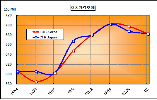 FOB Korea 680-685달러로 15달러 하락 … 동남아 PA 가동률 상승 O-X 가격은 12월 다섯째 주에 FOB Korea 톤당 683달러로 15달러 하락했다.아시아 O-X(Ortho-Xylene) 가격은 중국의 업스트림 M-X(Mixed-Xylene) 및 PA(Phthlate Ahydride) 구매 수요 하락에 따라 700달러가 붕괴됐다. 국제유가가 배럴당 42.6 달러로 하락한 영향으로 M-X 가격이 689달러로 보합세를 형성하고 중국의 최종수요처들이 춘절을 앞두고 구매를 보류하고 있기 때문이다.