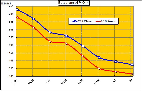 FOB Korea 315-325달러로 15달러 하락 … 일본은 정기보수 대응 부타디엔 가격은 1월 둘째 주에 FOB Korea 톤당 320달러로 15달러 하락했다.아시아 부타디엔(Butadiene) 가격은 국제유가 하락, 공급과잉, 다운스트림 수요 감소가 겹쳐 300달러 마저 위태롭게 됐다. 경제침체 심화에 대한 우려의 목소리가 높아지면서 국제유가가 배럴당 40.8달러로 하락하고 한국은 물론 일본, 유럽산이 유입되면서 공급과잉이 극에 달하고 있는 가운데 다운스트림 수요가 둔화됐기 때문이다. 롯데대산유화 및 일본 유통기업 한 곳이 중국 합성고무 생산기업에게 1000톤 물량을 CFR China 톤당 380달러에 판매한데 이어 유럽산 4000톤이 390-400달러에 공급된 것으로 알려지고 있다.