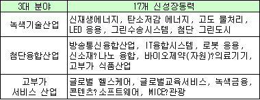 신ㆍ재생 에너지에 LED 포함 17개 선정 … 원천기술 연구개발 주력 미래 한국 경제를 이끌고나갈 새로운 성장엔진으로 신ㆍ재생 에너지, 글로벌 헬스케어(Health Care. 의료서비스) 등 17개 산업이 선정됐다.지식경제부는 이명박 대통령 주재로 국가과학기술위원회 및 미래기획위원회 합동회의를 열고 <신성장동력 비전 및 발전전략>을 확정했다. 17개 신 성장동력은 신재생에너지, 탄소저감 에너지, 고도수처리, LED(발광다이오드) 응용, 그린수송시스템, 첨단 그린도시 등 녹색기술 분야 6개 사업과 방송통신융합, IT 융합시스템, 로봇 응용, 신소재. 나노융합, 바이오제약ㆍ의료기기, 고부가식품산업 등 첨단 융합산업 6개다.