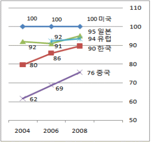 세계 최고수준 대비 90% 육박 … 중국 7%p 상승 빠르게 추격 지식경제부가 국내 IT산업의 기술 경쟁력이 세계최고 기술보유국 대비 90% 수준으로 선진국 대열에 진입했다고 밝혔다.국내 IT기술은 최고기술을 보유한 미국 대비 90% 수준으로 2006-08년 동안 4%p 상승함에 따라 일본(95%)과 유럽(94%)의 뒤를 바짝 추격하고 있다.