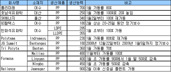 그러나 Reliance의 PP 90만톤 플랜트가 2월 본격 가동에 들어갈 예정이어서 귀추가 주목되고 있다. <이연숙 기자> 표, 그래프: | 아시아 폴리머 플랜트 가동현황 | <화학저널 2009/1/21> |