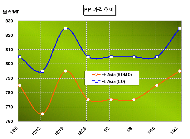 CFR FE Asia 790-800달러로 10달러 상승 … 중국 수입감소 주목 PP 가격은 1월 넷째 주에 CFR FE Asia 톤당 795달러로 10달러 상승했다.아시아 PP(Polypropylene) 가격은 업스트림 프로필렌 가격 하락에도 불구하고 공급부족 심화로 2주 연속 상승해 800달러를 넘보고 있다. 프로필렌 가격이 585달러로 하락하고 춘절을 앞두고 중국수요가 감소하고 있지만 인디아가 재고 부족으로 커버했기 때문이다. 여기에 장기간에 걸친 가동률 감축으로 재고가 바닥을 드러낸 가운데 아시아 수출기업들이 인디아로 수출선을 전환한 것도 PP 가격 상승에 영향을 미쳤다.