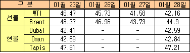 1월28일 WTI 0.58달러에 Brent 1.17달러 올라 … 두바이유도 강세 1월28일 국제유가는 미국의 석유제품 재고가 예상외로 감소하고, 오바마 정부의 경기부양책 기대감이 확산되면서 상승했다.한국석유공사에 따르면, 뉴욕상업거래소(NYMEX)의 WTI(서부텍사스 경질유) 선물유가는 배럴당 42.16달러로 0.58달러 올랐으며, Brent 선물유가는 44.90달러로 1.17달러 상승했다. 두바이(Dubai)유 현물유가는 1월23일에 비해 0.18달러 상승한 42.59달러에 거래를 마감했다.