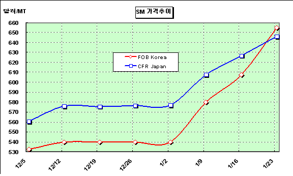 FOB Korea 655-656달러로 47달러 급등 … 미국산 대량 유입이 문제 SM 가격은 1월 넷째 주에 FOB Korea 톤당 655달러로 47달러 상승했다.아시아 SM(Styrene Monomer) 가격은 업스트림 벤젠(Benzene) 가격 상승과 공급부족으로 3주 연속 상승해 700달러를 넘보고 있다. 벤젠 가격이 367달러로 12달러 상승한 가운데 중국의 최종수요처들이 냉장고, 에어컨 등 가전제품 생산용 재고를 확보하기 위해 구매에 나서고 있지만 SM 생산기업들이 춘절 이후 가격 상승을 기대하고 판매를 보류하고 있기 때문이다. 일부에서는 2-3월 인도물량을 CFR China 톤당 685-695달러선에서 오퍼를 냈으나 최종수요처들은 630-640달러에 구매의사를 표시해 일부 무산된 것으로 파악되고 있다.