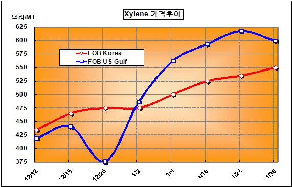 아시아 솔벤트(Solvent) 그레이드 M-X(Mixed-Xylene) 가격은 중국 춘절연휴에도 불구하고 공급부족이 장기화된 영향으로 1주 만에 상승세로 전환돼 500달러 중반으로 올라섰다.