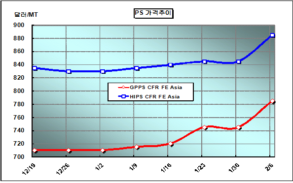 CFR FE Asia 780-790달러 형성 … 중국 재고 1-2주내 바닥 GPPS 가격은 2월 첫째 주에 CFR FE Asia 톤당 785달러로 40달러 상승했다.아시아 GPPS(General Purpose Polystyrene) 가격은 업스트림 SM(Styrene Monomer) 가격 상승과 수요 증가로 800달러를 넘보고 있다. 중국의 최종수요처들이 춘절 연휴를 마치고 본격 가동에 들어감에 따라 SM 유통기업들이 20008년 12월 및 2009년 1월 구입한 저코스트 재고를 처분하기 위해 공급가격을 685달러로 인상했기 때문이다. 그러나 HIPS(High-Impact PS) 가격도 40달러 상승해 스프레드는 100달러를 유지했다. 일부에서는 CFR Hong Kong 톤당 790-810달러에 오퍼를 냈으나 최종수요처들이 770-780달러에 구매의사를 나타냄으로써 무산됐다.
