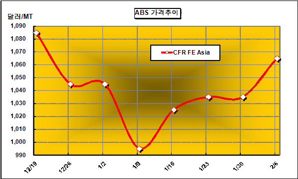 CFR FE Asia 1060-1070달러 형성 … 미국ㆍ유럽산 2만-3만톤 유입 ABS 가격은 2월 첫째 주에 CFR FE Asia 톤당 1065달러로 30달러 상승했다.아시아 ABS(Acrylonitrile Butadiene Styrene) 가격은 원료코스트 상승 및 중국의 수요 회복에 따라 1100달러를 앞두고 있다. 국제유가가 배럴당 40달러까지 곤두박질쳤음에도 불구하고 SM 가격이 685달러, 부타디엔이 465달러로 각각 20달러 상승했기 때문이다. 여기에 중국의 최종수요처들이 춘절 연휴를 끝내고 재고를 확보에 나선 것도 ABS 가격 상승에 영향을 미치고 있다.