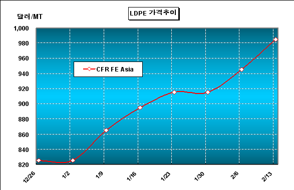 CFR FE Asia 980-990달러로 40달러 상승 … Sasol 30만톤 가동 LDPE 가격은 2월 둘째 주에 CFR FE Asia 톤당 985달러로 40달러 상승했다.아시아 LDPE(Low-Density Polyethylene) 가격은 국제유가 상승에도 중국의 구매수요가 호조를 나타냄으로써 1000달러를 코앞에 두고 있다. 중국의 최종수요처들은 국제유가가 하락하면 LDPE 구매에 소극적인 편이나 2월 둘째 주 국제유가의 급등락에도 불구하고 재고가 바닥을 드러냄에 따라 적극적으로 구매에 나섰기 때문이다. 중국에서는 LDPE가 CFR China 톤당 970-980달러에 거래된 것으로 알려졌다.